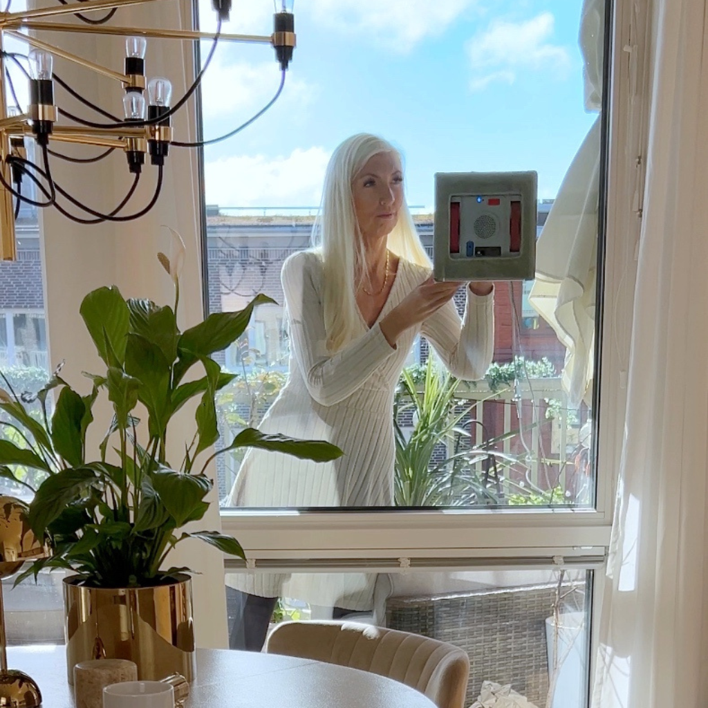 Den er nem at bruge: sæt strøm til, fastgør sikkerhedslinen, placer robotten på ruden og tryk start – så klarer den resten. Den ultrasoniske spray opløser snavs, mikrofiberkluden tørrer efter, og en stærk vakuummotor holder den stabil. Backup-batteri og alarm giver tryghed ved strømsvigt, og den slanke, kvadratiske form når helt ud i kanterne på både ramme- og rammeløse vinduer.