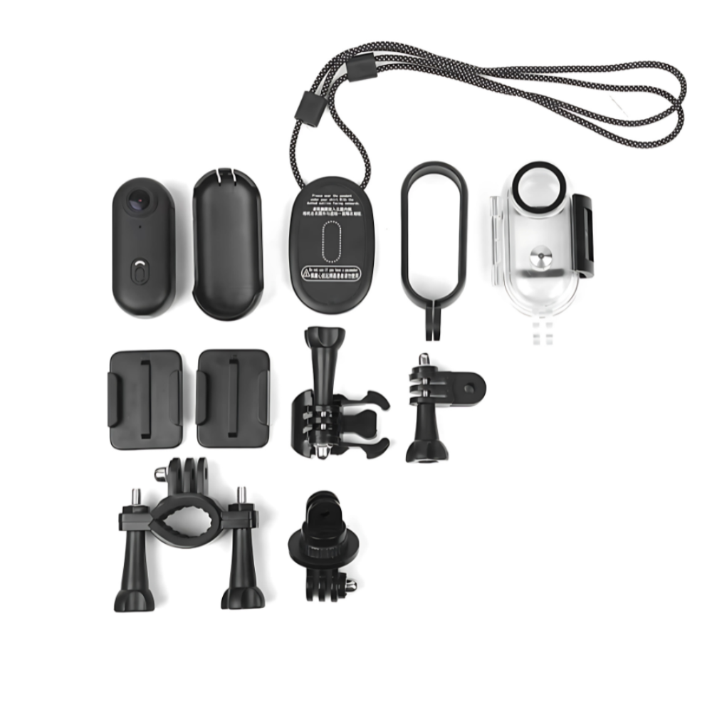 I kassen: Visual GoCam Mini kamera, USB-C kabel, manual, vandtæt case (30 m), frame-mount, back-clip, lanyard, magnetisk lanyard, cykel-mount, side-mount, 360° adapter, buet base, flad base, hjelm-mount, MicroSD(medfølger ikke).