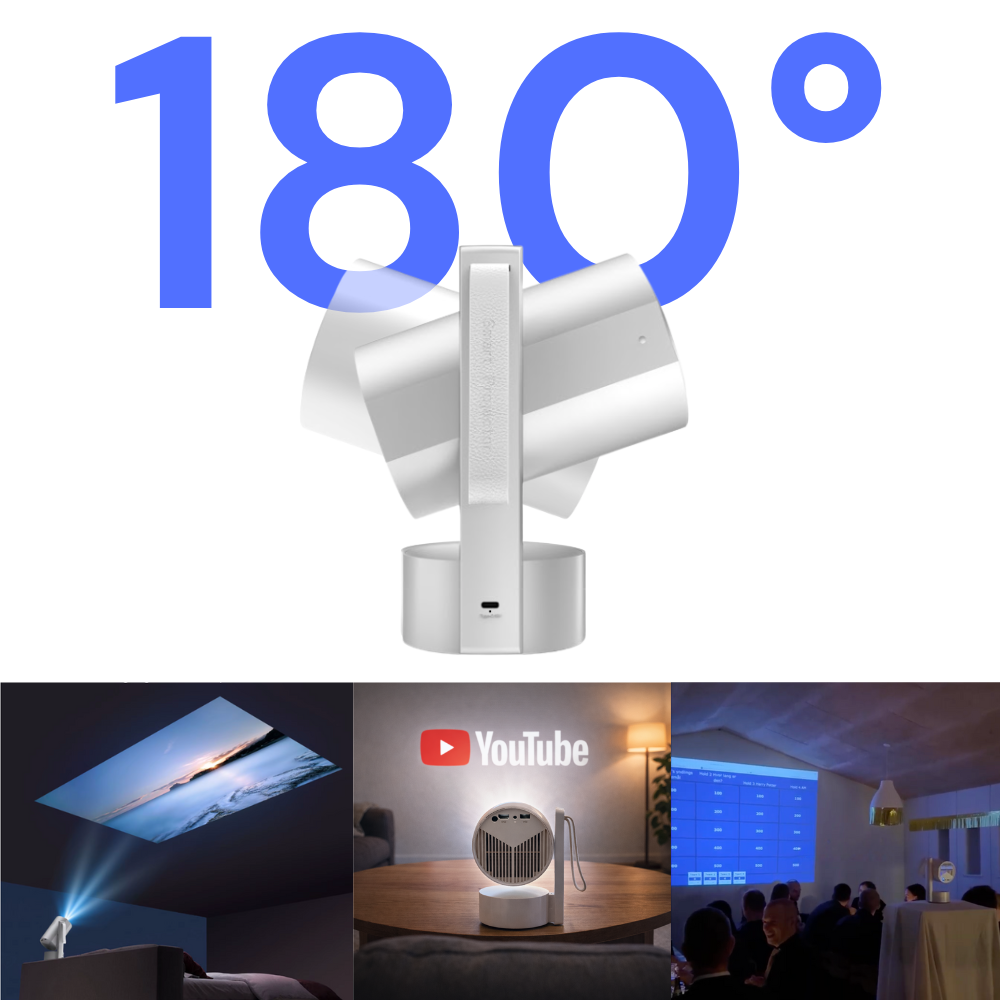Den indbyggede Android 13 Smart OS giver dig adgang til dine favoritapps direkte på projektoren. Dual-band Wi-Fi (2,4/5 GHz) sikrer stabil streaming, og Bluetooth gør det nemt at tilslutte ekstern højttaler eller hovedtelefoner. Det fleksible 180° roterbare design, sammen med auto focus og automatisk keystone, gør det let at få et lige og skarpt billede – selv på loft eller skråvæg.